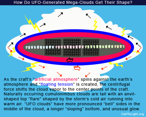 Now one might ask — what about the shape of this cloud? Cumulonimbus clouds have that tell-tale bulbous shape, too, so couldn’t the Bejing Cloud just be a thunder cloud? Well, yes, but it’s not, and the cloud has a few “tells” that if you know what you’re looking for — gives it away. As the craft’s “artificial atmosphere” spins against the earth’s atmosphere and “floating tension” is created, the centrifugal force shifts the cloud vapor to the center points of the craft. Naturally occurring cumulonimbus clouds are tall with an anvil-shaped top “flare” shaped by the storm’s cold air running into warm air. “UFO clouds” have more pronounced “bell” sides in the middle of the cloud, a longer “sloping” bottom, and unusual glow.